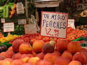 The produce was out of this world. At this stand the vendor was cutting off peach samples. When I tasted it I said, "Oh my God." My sister said, "look that is what the sign says." Peaches are my favorite fruit anyway so of course I had to get some.